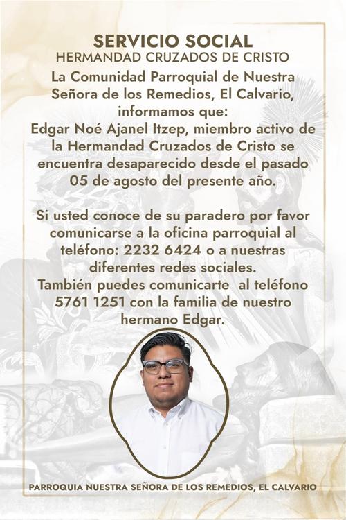 Edgar Noé Ajanel Itzep, de 32 años, no ha sido visto desde el 5 de agosto, cuando salió de su trabajo en la zona 14 para dirigirse a su hogar. Su desaparición ha generado gran preocupación en la comunidad religiosa de Nuestra Señora de los Remedios, El Calvario.