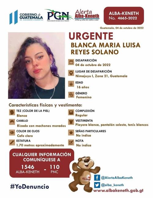 Los padres de una joven de 16 años activaron una alerta Alba-Keneth para apresurar la ubicación de Blanca María Luisa Reyes Solano.