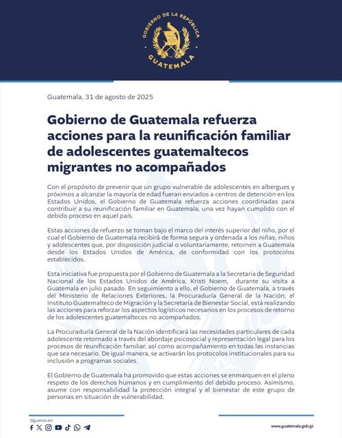 "El Gobierno de Guatemala ha promovido que estas acciones se enmarquen en el pleno respeto de los derechos humanos y en cumplimiento del debido proceso. Asimismo, asume con responsabilidad la protección integral y el bienestar de este grupo de personas en situación de vulnerabilidad", concluye el texto.