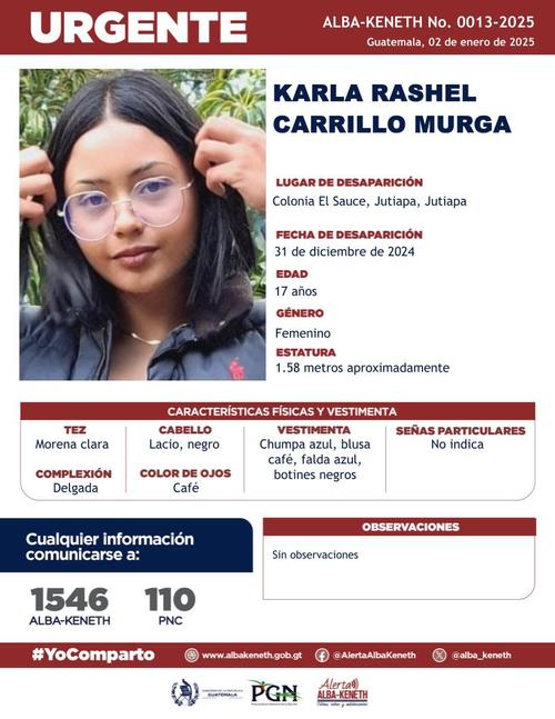 Familiares y amigos se encuentran en busca de Karla Rashel Carrillo Murga de 17 años, quien desapareció el pasado 31 de diciembre, según detalla una alerta Alba-Keneth que se encuentra activa.