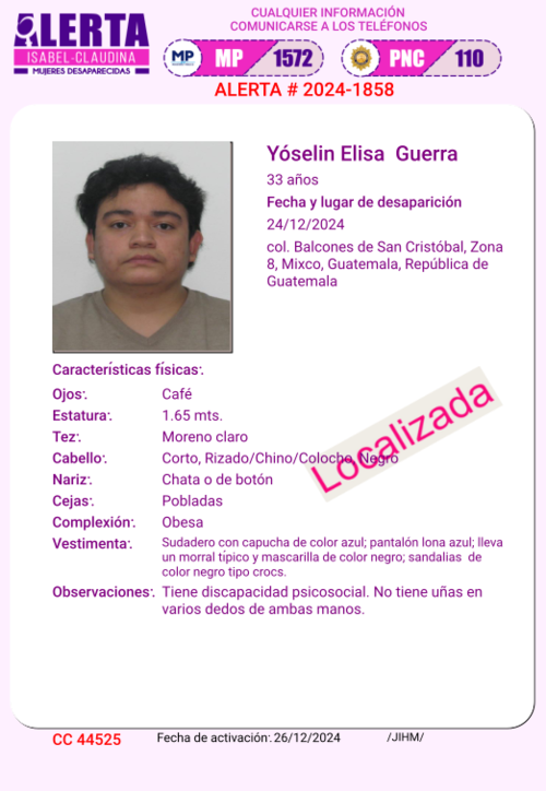 Yoselin Elisa Guerra, la mujer desaparecida la noche del 24 de diciembre, cuya alerta Isabel Claudina fue activada el 26 de diciembre, ha sido localizada con vida y ya se encuentra junto a su familia.
