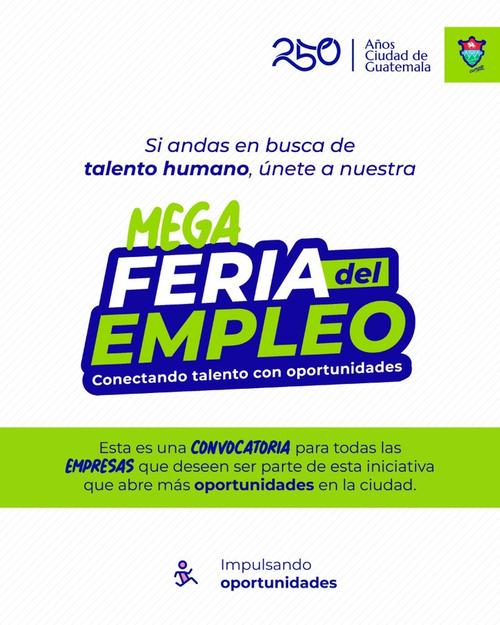 La Municipalidad de Guatemala invita a todas las empresas de la ciudad que estén en busca de talento humano, a unirse a la Mega Feria del Empleo, la cual se estará llevando en varios puntos de la ciudad.