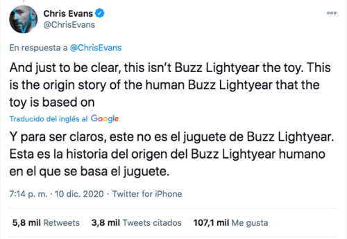 “Para ser claros, esto no es sobre el juguete de Buzz Lightyear. Es la historia del origen del humano Buzz Lightyear en el que se basa el juguete”, escribió el propio Evans después del anuncio.