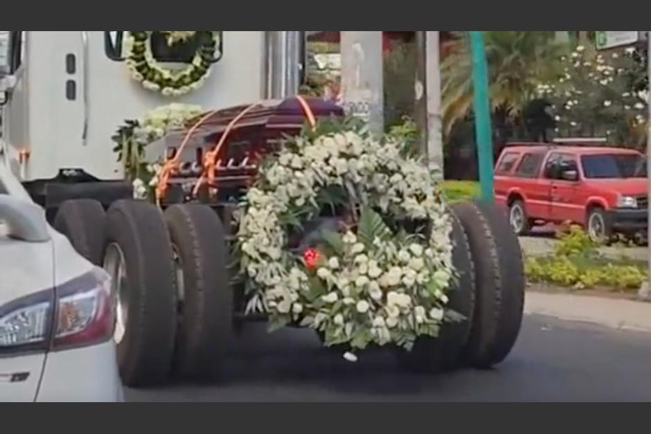 Las imágenes se hicieron virales este martes 23 de enero, y se observó que el ataúd fue colocado en la estructura trasera de un cabezal de transporte pesado, mientras estaba siendo dirigido por Ciudad San Cristóbal, Mixco.