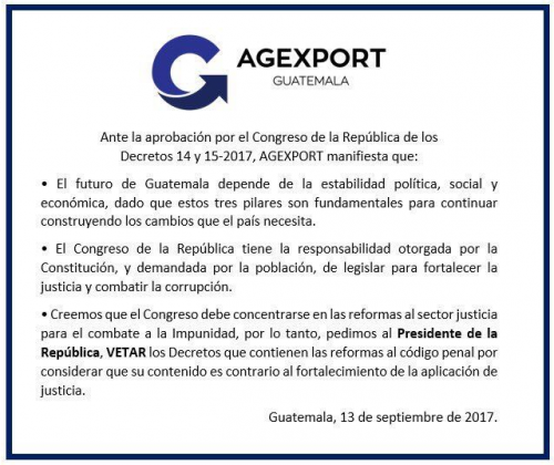 El Comité coordinador de asociaciones agrícolas, comerciales, industriale y finacieras (Cacif) y Agexport publicaron comunicados en los que coinciden en pedir al Presidente Jimmy Morales que vete los acuerdos 14-2017 y 15-2017 que recogen las reformas al Código Penal realizadas por el Congreso de la República este día.