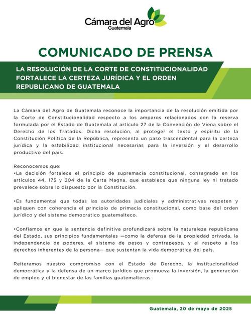 Además, aseguran que con la medida, se reafirma el principio de supremacía constitucional, se brinda certeza jurídica tanto a ciudadanos guatemaltecos como a actores económicos y sociales, nacionales e internacionales, así como se fortalecen los pilares del sistema republicano.