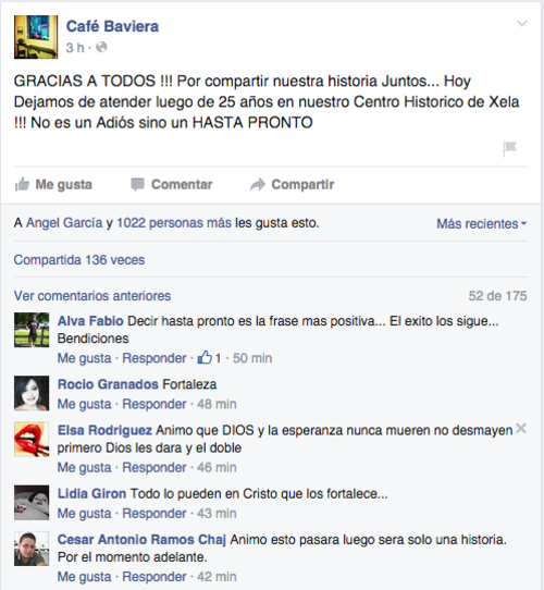 En la fanpage de Café Baviera muchas personas han expresado su sentir y su tristeza por la pérdida de ese cuarto de siglo de anécdotas.