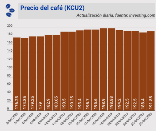 El quintal de café abrió este miércoles 26 de abril superando los US$190 dólares por quintal (US$191,85). Es decir, un aumento de 1.5% respecto del cierre anterior.