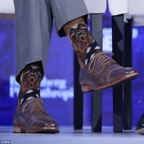 El mandatario sorprendió a los presentes con una insólita combinación entre sus zapatos color marrón, su traje y calcetines de Chewbacca, uno de los icónicos personajes de la película "Star Wars".