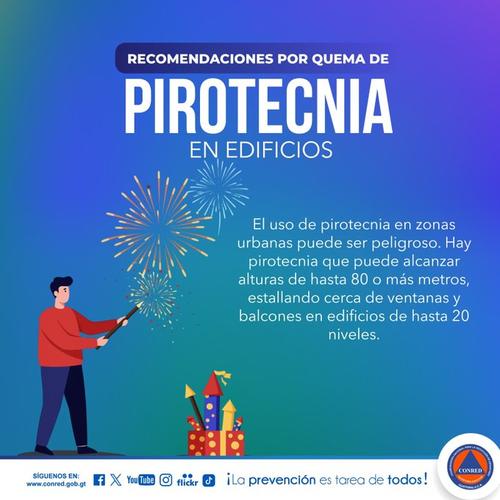 Por su parte, la La Coordinadora Nacional para la Reducción de Desastres (Conred) hace algunas recomendaciones sobre la quema de pirotecnia, sobre todo en zonas urbanas.