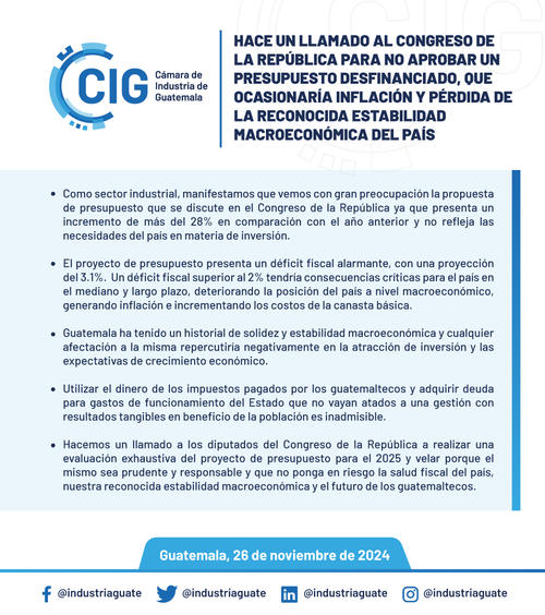 El Presupuesto General de la Nación, que se pretende aprobar para el próximo año, está desfinanciado y ocasionaría la "pérdida de la reconocida estabilidad macroeconómica del país", opina la Cámara de Industria de Guatemala.