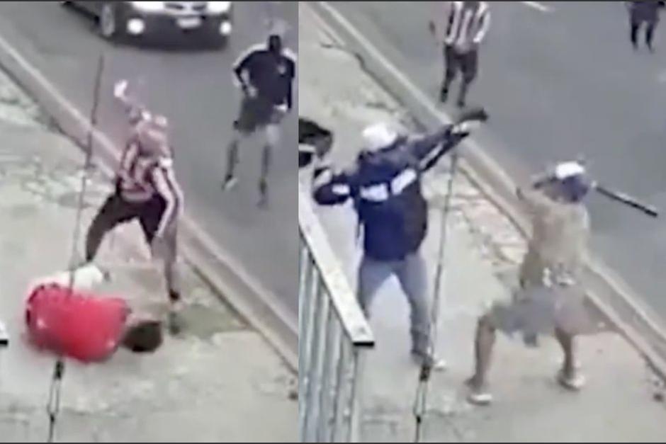 El video captó cuando un hombre con una camisola del Municipal camina por la acera y otro con la camisola del Olimpia se cruza la calle entre los vehículos y aparece por atrás golpeando al aficionado guatemalteco quien cayó al suelo donde recibe varios golpes con mano y pies por parte de dos personas.