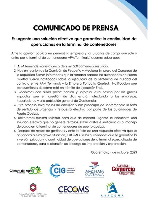 Asimismo, hicieron ver que se generarían atrasos, sobrecostos e ineficiencia en el manejo de carga en Puerto Quetzal, si no se resuelve la situación con prontitud.