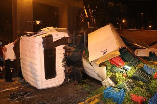 Un camión que transportaba verduras en horas de la noche, quedó volcado sobre la cintas asfáltica en la zona 3 capitalina.