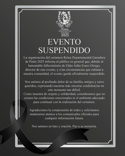 "La organización del certamen Reina Departamental Ganadera 2025 informa al público en general que, debido al lamentable fallecimiento de Elder Adán Erazo Orrego, director de este evento, y a las circunstancias que enlutan a nuestra comunidad, el evento queda oficialmente suspendido", dice parte del comunicado.