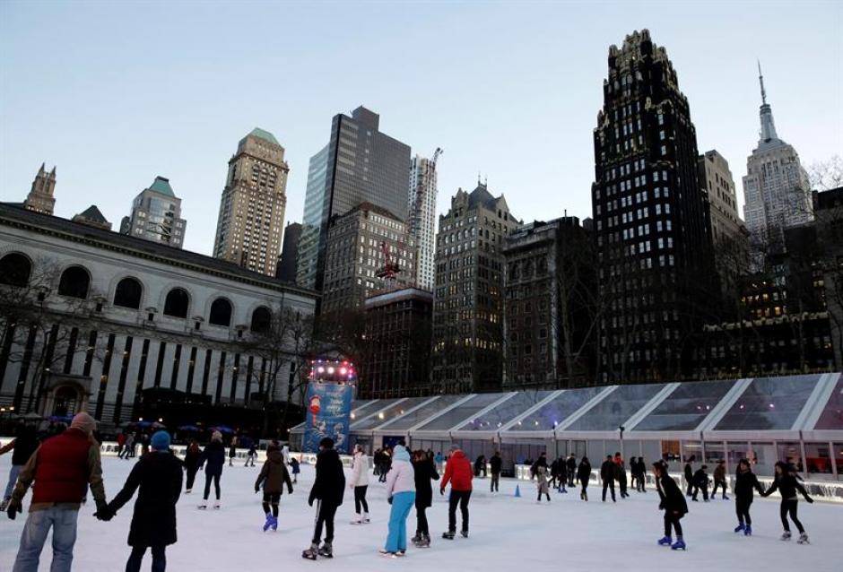Decenas de personas patinan sobre hielo en el Parque Bryant Park en Manhattan, Nueva York ante la amenaza de una fuerte tormenta de nieve. (Foto: EFE)