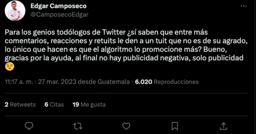 "Para los genios todólogos de Twitter ¿si saben que entre más comentarios, reacciones y retuits le den a un tuit que no es de su agrado, lo único que hacen es que el algoritmo lo promocione más? Bueno, gracias por la ayuda, al final no hay publicidad negativa, solo publicidad", comentó.