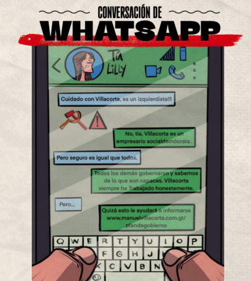 Dentro del documento, el partido VOS aprovechó para desmentir que Villacorta es de izquierda, lo hicieron simulando una conversación de WhatsApp, siempre en caricatura.