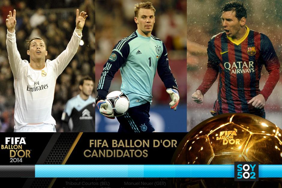 El argentino Lionel Messi, el portugués Cristiano Ronaldo y el alemán Manuel Neuer, fueron elegidos como los tres candidatos finales al premio Balón de Oro 2014 por parte de la FIFA y el revista France Football.