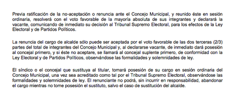 De León se basa en el Artículo 46 del Código Municipal que estipula que una causa para no aceptar o renunciar al cargo de alcalde es ser mayor de 70 años. Arzú cumple esa edad el 14 de marzo de 2016, es decir dos meses después de asumir, en caso de que ganase su reelección.