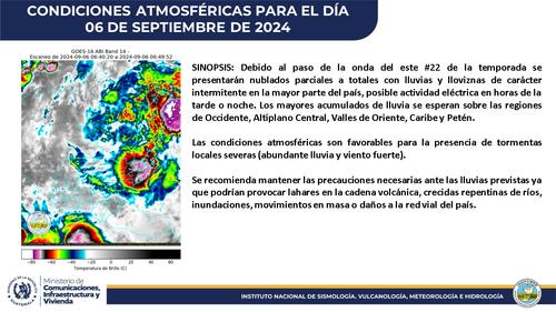 El Instituto Nacional de Sismología, Vulcanología, Meteorología e Hidrología (Insivumeh) informa que debido al paso de la onda del este no.22 de la temporada se presentarán nublados parciales a totales.