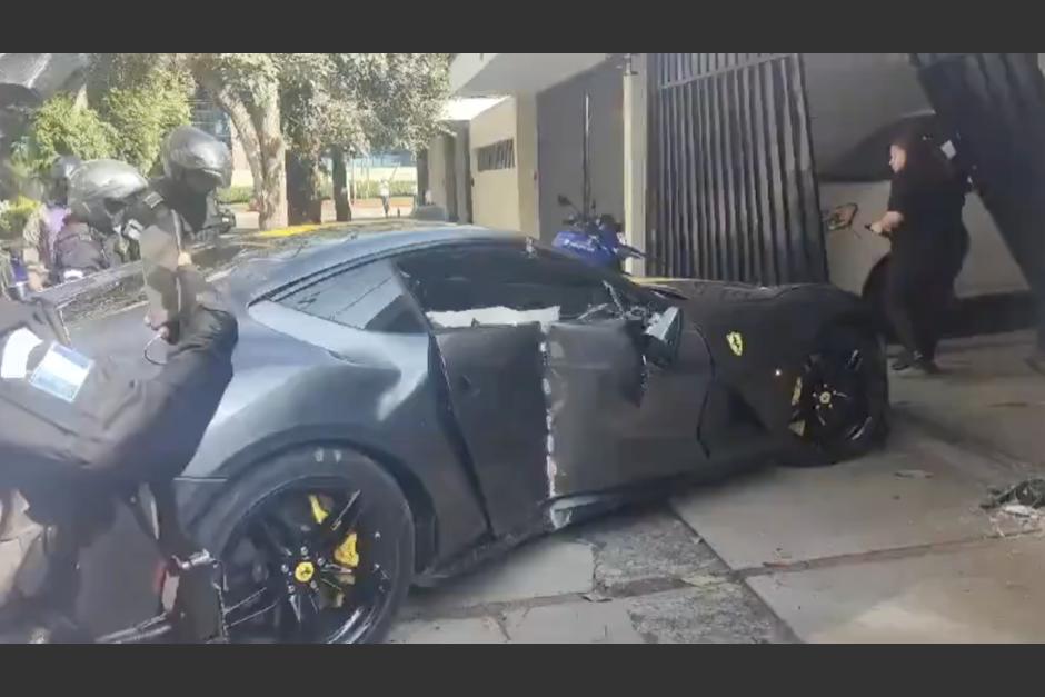 Las imágenes dan cuenta de que un vehículo Ferrari de color oscuro se empotró en una vivienda, presuntamente en la zona 14 de la Ciudad de Guatemala.