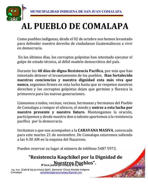 Líderes indígenas de Sacapulas, Quiché, confirman caravana hacia la ciudad capital, este martes 21 de noviembre. Saldrán a la 1:00 de la madrugada del parque central de ese municipio. pic.twitter.com/e9ySOYRH2a