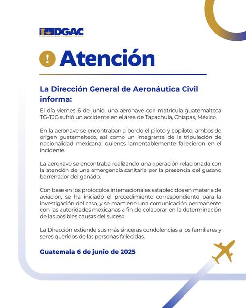 En un comunicado, la Dirección General de Aeronáutica Civil (DGAC) dio a conocer que la avioneta se encontraba realizando una operación relacionada con la atención de una emergencia sanitaria, por la presencia de gusano barrenador del ganado.