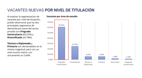 Para estas nuevas vacantes, habrá una fuente demanda laboral por perfiles ocupacionales en el área operativa, siendo el 97.62% de las plazas, 2.29% en vacantes del área administrativa y únicamente 0.08% para el área gerencial. Estas nuevas vacantes buscan a personas con un nivel de titulación a nivel de pregrado universitario (60.67%) y diversificado (24.78%). Cabe destacar que el técnico o diplomado y el nivel de primaria son demandados en la misma magnitud, apenas con un 5.64%.