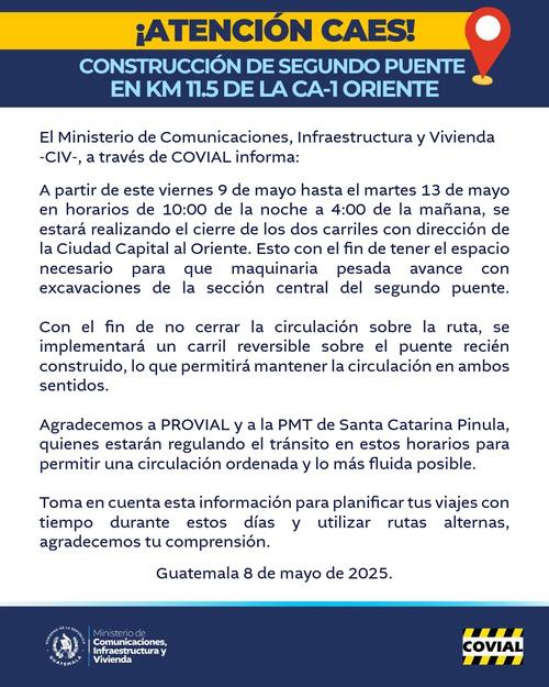 A las 4:00 de la madrugada del martes 13 de mayo quedará habilitado por completo el paso vehicular en el kilómetro 11.5 de la Carretera a El Salvador, luego del cierre temporal que se mantuvo durante tres días, según lo informado oficialmente por la Unidad Ejecutora de Conservación Vial (Covial) del Ministerio de Comunicaciones, Infraestructura y Vivienda (CIV).