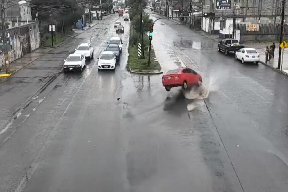 Las imágenes dan cuenta que el vehículo busca cruzar al otro sentido de la vía, cuando cae en un enorme agujero y termina volcado.