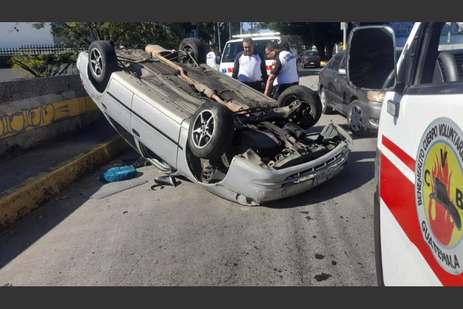 Los Bomberos Voluntarios reportaron que, durante la mañana de lunes 20 de noviembre, un conductor perdió el control de su vehículo y volcó en pleno tránsito de la diagonal 17 y 27 calle del Anillo Periférico, zona 11 de la Ciudad de Guatemala.