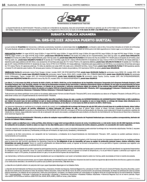 La Superintendencia de Administración Tributaria (SAT) publicó en el Diario de Centro América el anuncio de la Subasta GRS-01-2023, la cual se realizará en el Salón de la Aduana de Puerto Quetzal, ubicado en la Puerta de Hierro, San José, Escuintla, el próximo 9 de marzo a las 9:00 horas.