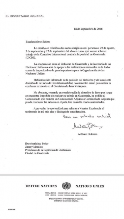 El Secretario General de la Organización de Naciones Unidas (ONU), Antonio Guterres, le envió una carta al presidente Jimmy Morales en la que le manifiesta que "no encuentra razón para retirar la confianza existente en el comisionado Iván Velásquez".