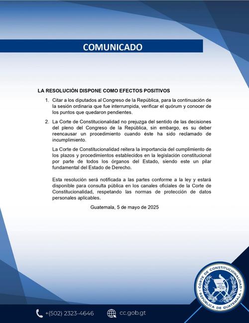 Minutos más tarde que la CC beneficiara a por lo menos 8 diputados, el Congreso de la República informó que: "En cumplimiento de la Constitución Política de la República, la Ley Orgánica del Organismo Legislativo, y la resolución de la Corte de Constitucionalidad en el expediente 3051-2025, se convoca a la reanudación de la 19ª #SesiónOrdinaria adicional el martes 6 de mayo a partir de las 14:00 horas".