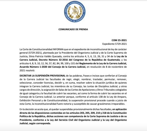 En un comunicado de prensa, la CC explicó que decretó la suspensión provisional de las palabras, frases e incisos que conferían al Consejo de la Carrera Judicial las facultades para “regir, elegir, nombrar, trasladar, permutar, remover, seleccionar, conceder licencias, decidir y en suma revolver sobre la situación jurídica de quienes integran la Carrera Judicial”.