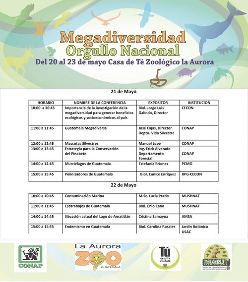 El Parque Zoológico Nacional La Aurora, en cooperación con el Consejo Nacional de Áreas Protegidas (CONAP), el Museo de Historia Natural de la Universidad de San Carlos de Guatemala (MUSHNAT) y la Municipalidad capitalina presentarán la exposición “Megadiversidad: Orgullo Nacional” por motivo de la celebración del Día Internacional de la Diversidad Biológica.