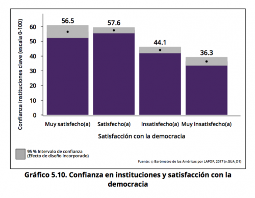 No obstante, un poco más de un tercio de los guatemaltecos, es decir 34.3% confían en las elecciones, lo que representa un incremento de siete puntos porcentuales comparados con 2014. La confianza en los partidos políticos se mantuvo estable, en un 14.6%. Aunque, la simpatía con las agrupaciones políticas cayó cinco puntos porcentuales y llegó a 5.9%, lo que significa el nivel más bajo desde que se efectúa el estudio.