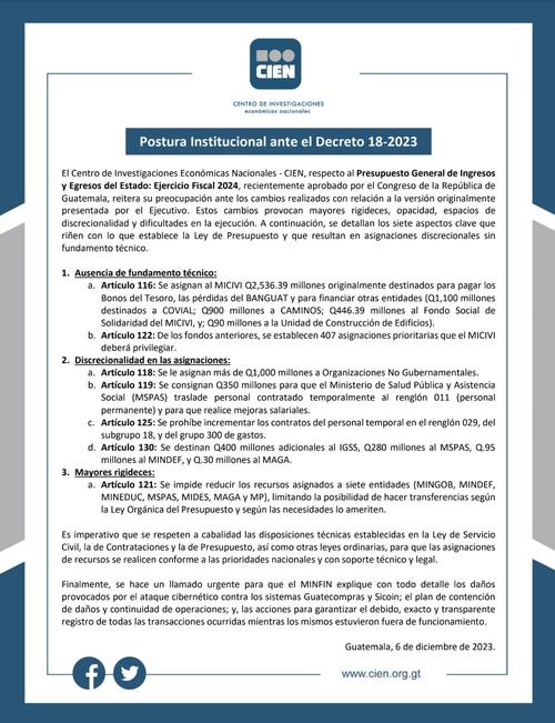Otro aspecto que, según el CIEN, se hizo a discreción fue prohibir el incremento de contratos de personal temporal, así como la distribución de recursos adicionales a carteras como Defensa Nacional, Salud y Agricultura, alcanzando también al Instituto Guatemalteco de Seguridad Social (IGSS).