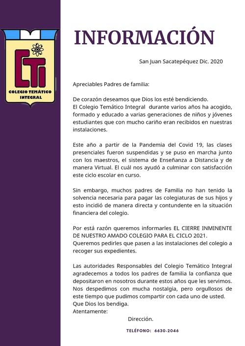 El Colegio Temático Integral, ubicado en la zona 2 del municipio de San Juan Sacatepéquez, en el departamento de Guatemala informó a los padres de familia que no podrá continuar operando e informaron del cierre del mismo.