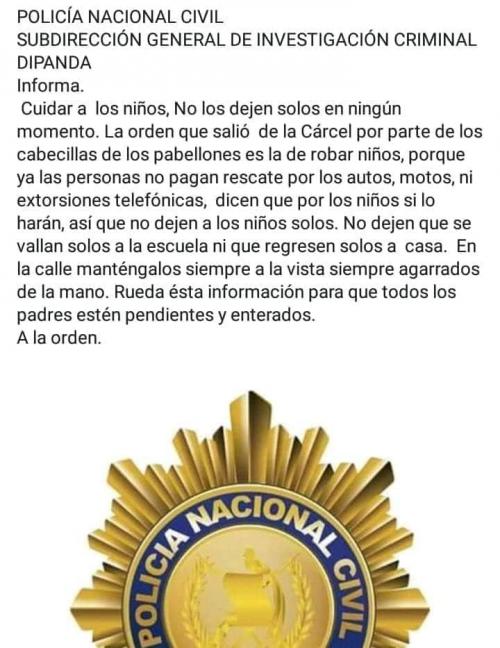 El mensaje va acompañado de una fotografía del escudo de la Policía Nacional Civil (PNC) y se asegura que la Subdirección General de Investigación Criminal de la PNC es la que advierte de esta modalidad.