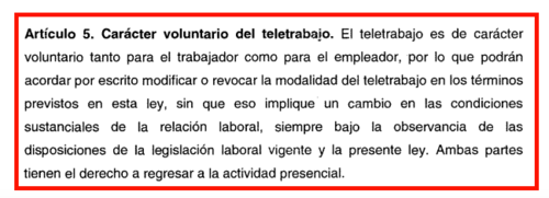 En la propuesta que se discute en el Congreso, se especifica que el teletrabajo se tendría que adoptar como una medida voluntaria, acordada entre el patrono y el empleado, que tendría que quedar expresa en el debido contrato.