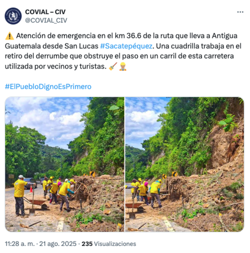 La Unidad Ejecutora de Conservación Vial (Covial) informó que una cuadrilla trabaja en el retiro de tierra y rocas que obstruyeron el paso en un carril, específicamente en el kilómetro 36.6.