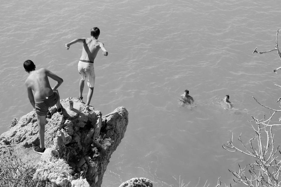En las imágenes se observa a un grupo de personas que disfrutan de un chapuzón y que alientan al clavadista.
