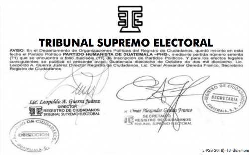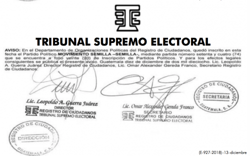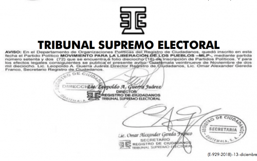 Esta dependencia del TSE publicó los avisos legales de inscripción de las agrupaciones Prosperidad Ciudadana (PC), Movimiento Semilla (Semilla), Partido Humanista de Guatemala (PHG) y el Movimiento para la Liberación de los Pueblos (MLP).