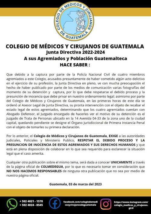 El colegio de Médicos de Guatemala (Colmedegua) ha emitido un comunicado luego de que se detuviera a cuatro médicos señalados por disposición ilegal de órganos o tejidos humanos.