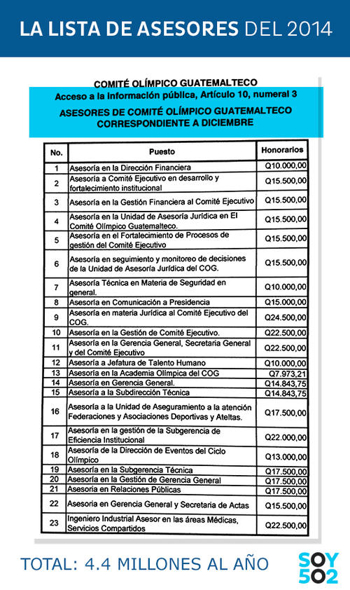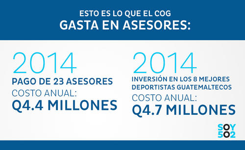 El costo mensual del grupo de asesores al servicio del COG representaba 372 mil 660 quetzales al mes, 4.4 millones de quetzales en 2014, un monto similar a los 4.7 millones que sumó en 2014 la preparación y becas de los ocho mejores deportistas de Guatemala: Erick Barrondo, Ana Sofía Gómez, Elizabeth Zamora, Kevin Cordón, Juan Ignacio Maegli, Mirna Ortiz, Cheili González y Jean Pierre Brol.
