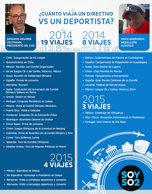 Como lo demuestra este cuadro comparativo, Aguirre duplica en 2014 los viajes de entrenamiento y preparación que pudo tener el medallista olímpico, Erick Barrondo.