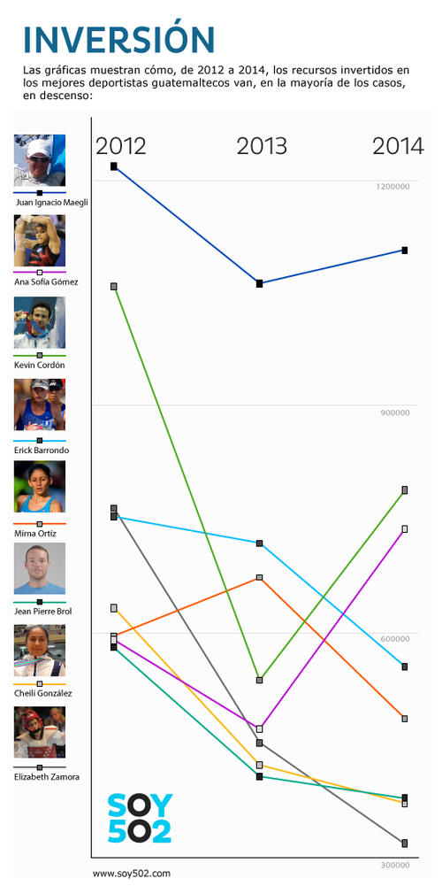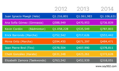 En 2012, año en el que Barrondo obtuvo la medalla de plata olímpica en Londres, la inversión económica en su preparación (beca, fogueos y entrenador) fue de 752 mil quetzales. Un año más tarde recibió 717 mil quetzales e inexplicablemente, en 2014, su inversión descendió a 553 mil quetzales.