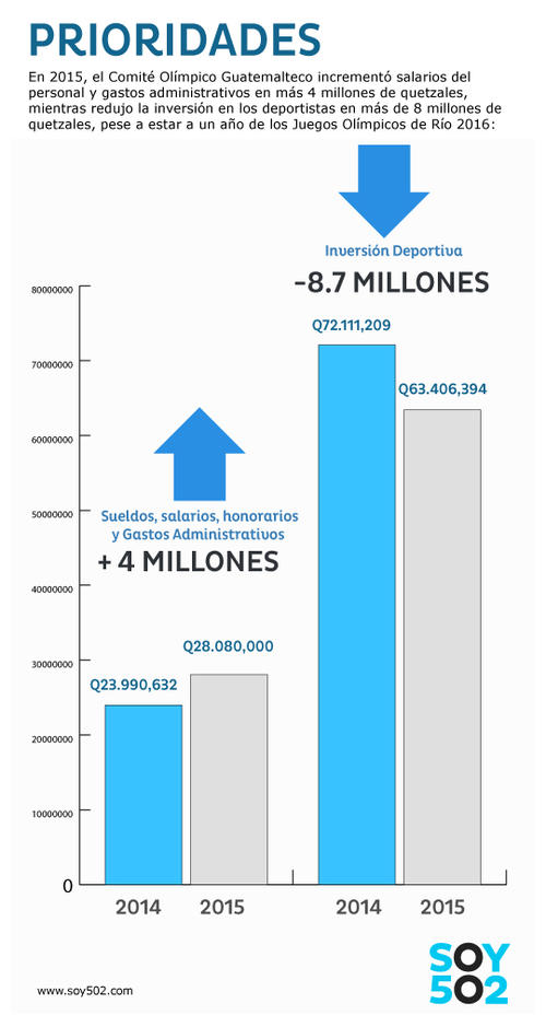 En el año en el que se disputan los Juegos Panamericanos de Toronto y a un año de la celebración de los Juegos Olímpicos de Río, la dirigencia del Comité Olímpico Guatemalteco (COG), encabezada por el Presidente del Comité Ejecutivo, Gerardo Aguirre, decidió recortar 8.7 millones de quetzales de la inversión económica en los mejores deportistas del país y decidió utilizar al menos 4 millones para incrementar salarios administrativos y otros gastos de funcionamiento e inversión, como la remodelación de un edificio que la institución estrenó en 2011.